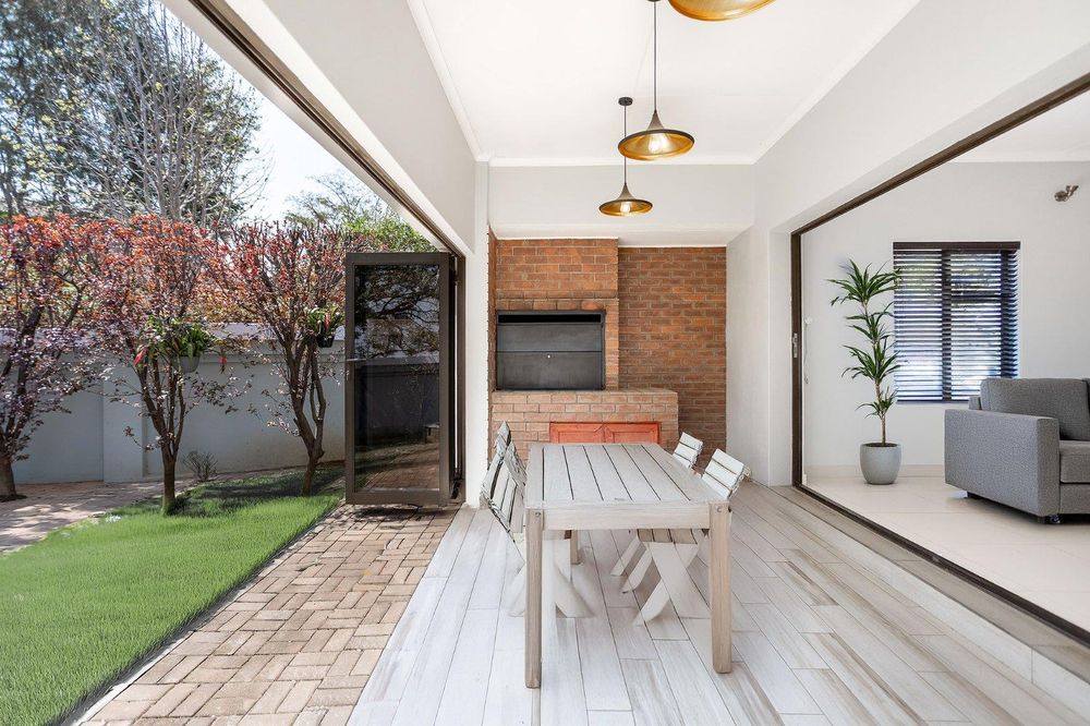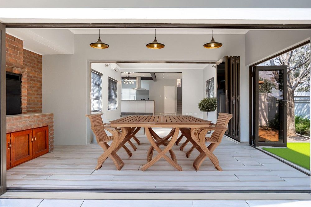 The flowing open-plan design seamlessly connects the dining room, TV lounge, and enclosed patio with built-in braai, all overlooking the sparkling pool, creating a warm and inviting indoor-outdoor lifestyle.